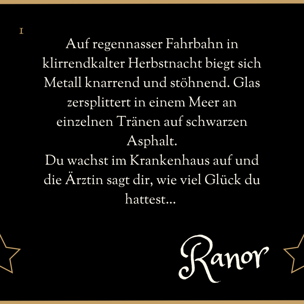 Auf regennasser Fahrbahn in klirrendkalter Herbstnacht biegt sich Metall knarrend und stöhnend. Glas zersplittert in einem Meer an einzelnen Tränen auf schwarzen Asphalt.