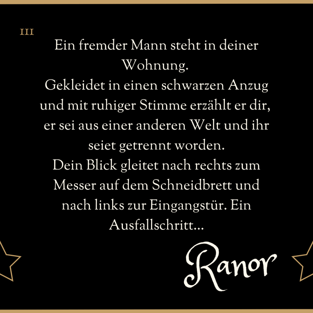 Dein Blick gleitet nach rechts zum Messer auf dem Schneidbrett und nach links zur Eingangstür. Ein Ausfallschritt…